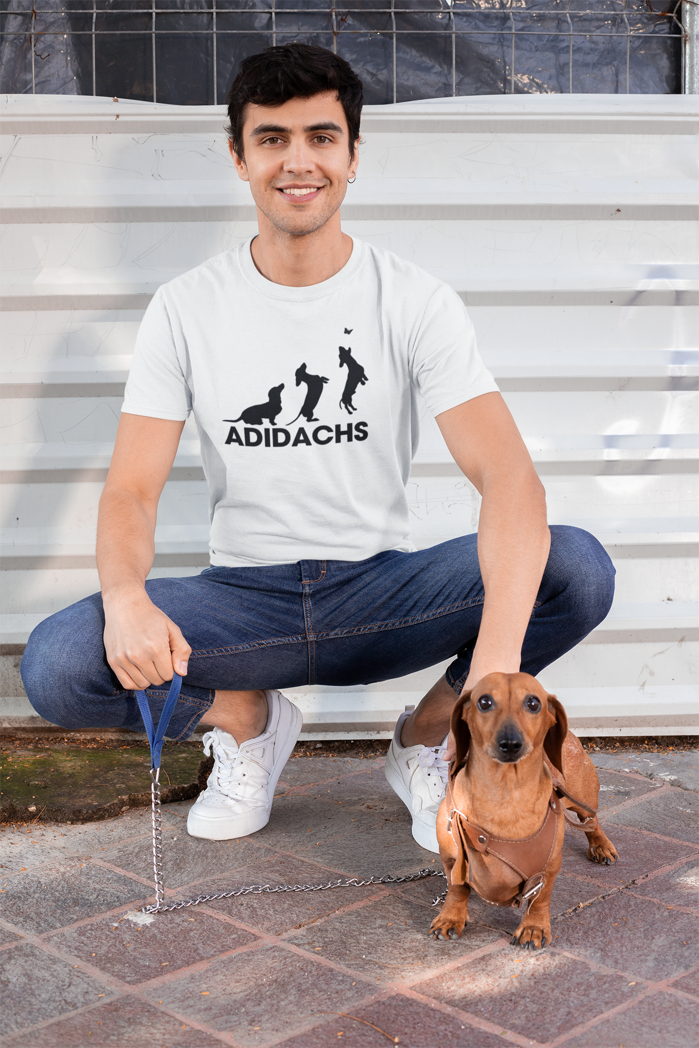 Celebrate the charm and playfulness of the beloved dachshund with the Duwweltjie® Adidachs T-Shirt. Featuring a whimsical design of a dachshund in motion as it leaps for a butterfly, this shirt creatively nods to iconic athletic branding while staying true to canine charisma. Perfect for dog lovers and trendsetters alike, this shirt combines humor, style, and comfort in one unique piece. Available in versatile sizes and colors, it’s an ideal way to showcase your love for man’s best friend.