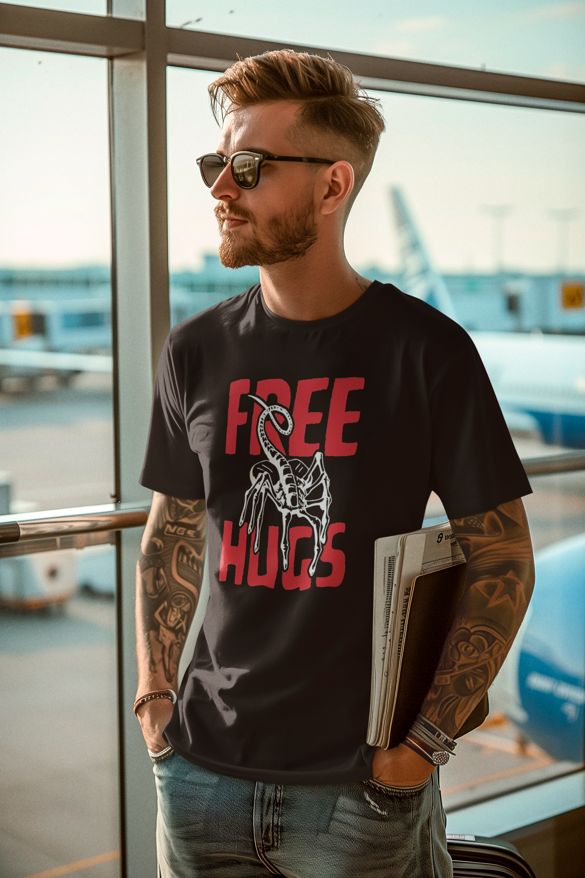Nothing says “I’m approachable” like a parasitic alien attached to your face. The Duwweltjie® "Free Hugs" tee for men features a sharp, red graphic of a facehugger and a punchy sense of humor. Made from 100% cotton with a comfortable fit—perfect for horror nerds, sci-fi fans, or anyone who enjoys hugs with... strings attached.